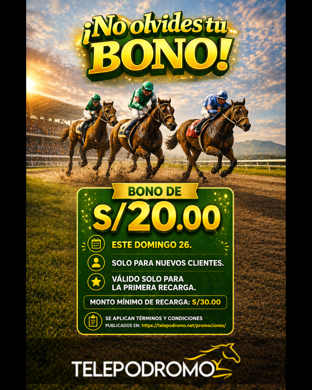 – El bono solo podrá utilizarse para realizar apuestas en carreras del Hipódromo de Monterrico, en cualquiera de sus jugadas o productos habilitados.